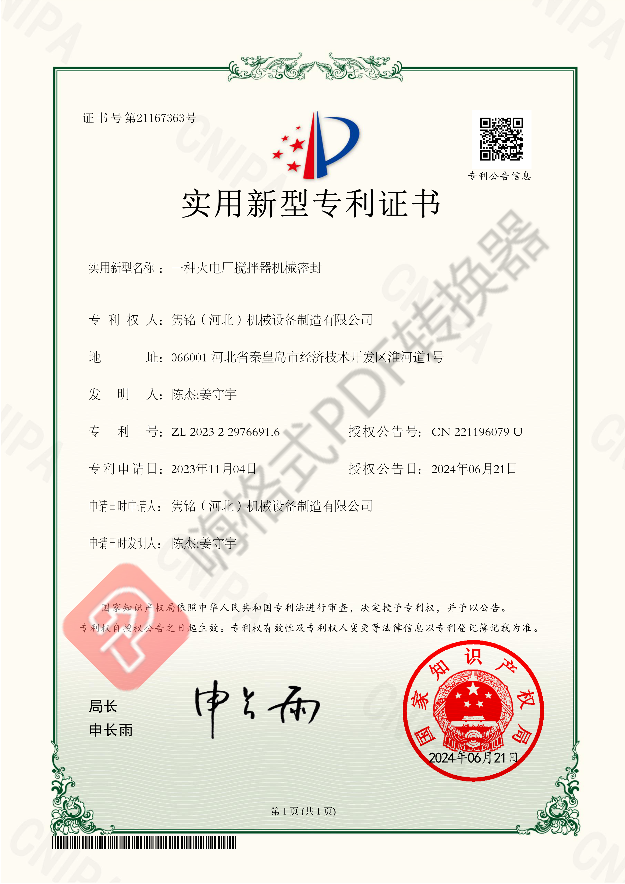 熱烈祝賀我公司研發(fā)的一種火電廠攪拌器機(jī)械密封,于2024年6月21日獲國家知識產(chǎn)權(quán)局發(fā)明專利授權(quán)!專利號ZL 2023 2 2976691.6。
