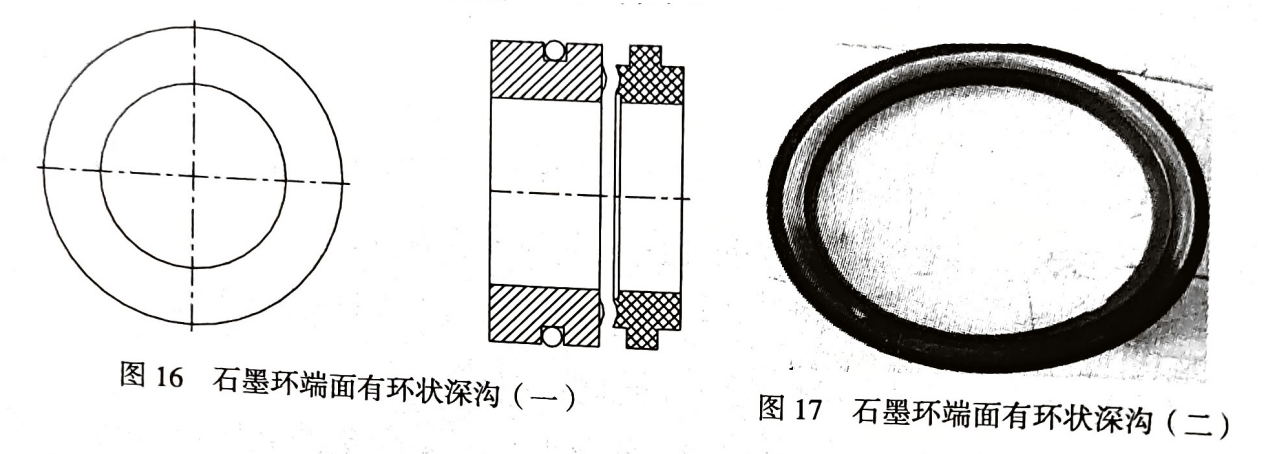 (6)端面過(guò)熱過(guò)載(易發(fā)生在溫度較高的平衡型和非平衡型機(jī)械密封上 ),石墨撕裂附在硬環(huán)上,磨損石墨,發(fā)生粘著磨損。高溫下冷卻水結(jié)垢,磨掉石墨內(nèi)緣,補(bǔ)償環(huán)失去補(bǔ)償性。