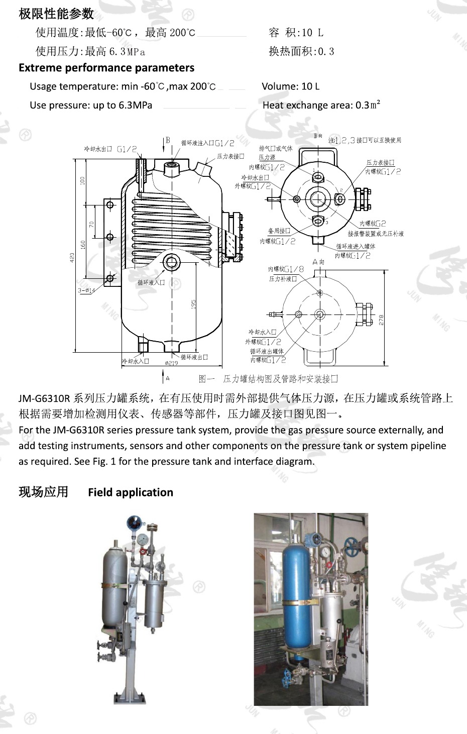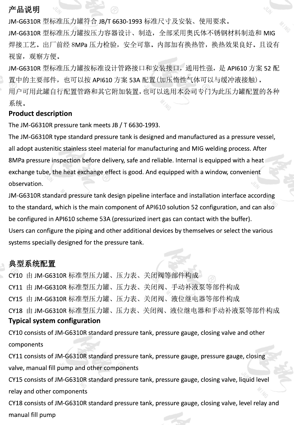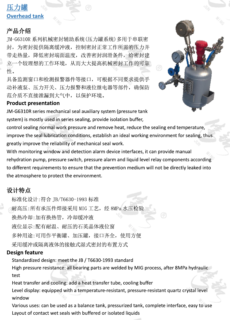 JM-G6310R系列機(jī)械密封輔助系統(tǒng)(壓力罐系統(tǒng))多用于串聯(lián)密封,為密封提供隔離緩沖液,控制密封正常工作所需的壓力并帶走熱量,降低密封端面溫度,改善密封潤滑條件,給密封建立一個較理想的工作環(huán)境,從而大大提高機(jī)械密封工作的可靠性。