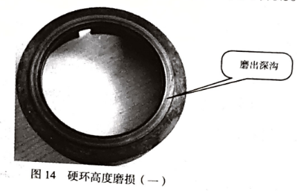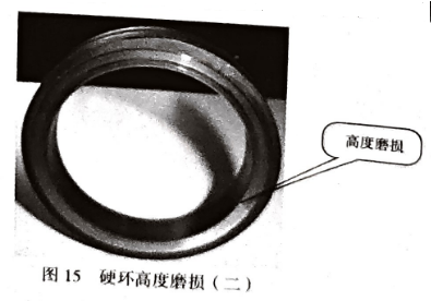 密封硬環(huán)高度磨損,軟環(huán)使硬環(huán)磨出凹形的均勻深槽(圖14、圖15)。硬環(huán)表面熱裂。軟環(huán)高度磨損,有石墨粉末堆積,外緣可能有切邊。