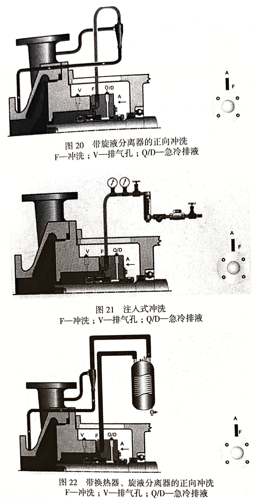 (2)選用合適的沖洗方案,減少顆粒磨損,改善工作環(huán)境。可選用 AP 682《機(jī)械密封》的 31、32、41方案,其中 31方案是帶旋液分離器的正向沖洗方案,它適用于含固體重質(zhì)顆粒的流體,帶走端面摩擦熱,去除固體顆粒。32方案是注入式?jīng)_洗方案,適用于含固體顆粒介質(zhì)或易汽蝕、抽空的流體。41方案是帶換熱器、旋液分離器的正向沖洗方案,適用于含固體重質(zhì)顆粒的流體。圖20是 31方案,圖21是32方案,圖 22 是 41 方案。