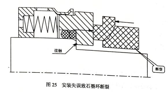 (3)平衡型密封,由于安裝失誤,軸套臺階頂住動環(huán)臺階,軸向力太大,造成石墨環(huán)斷裂(圖 25)