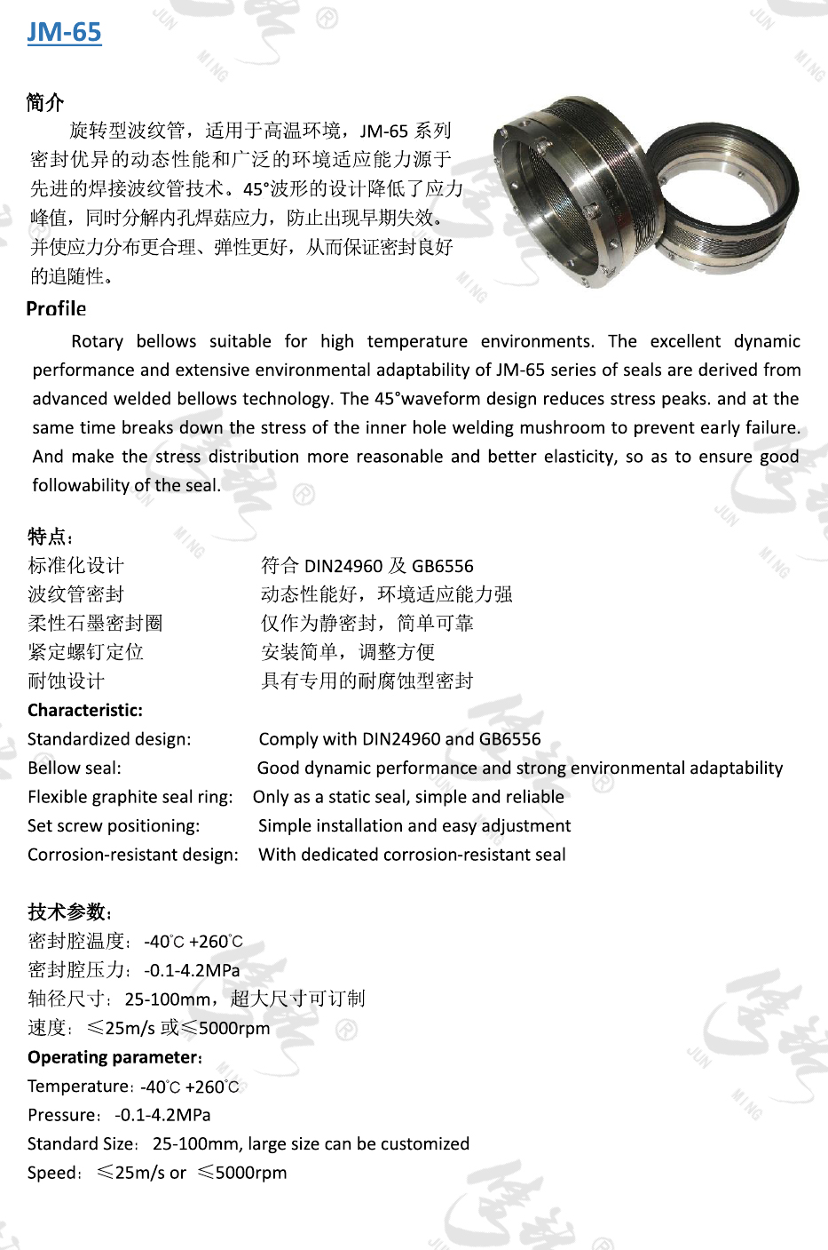旋轉(zhuǎn)型波紋管,適用于高溫環(huán)境,JM-65系列密封優(yōu)異的動態(tài)性能和廣泛的環(huán)境適應(yīng)能力源于先進(jìn)的焊接波紋管技術(shù)。45°波形的設(shè)計降低了應(yīng)力峰值,同時分解內(nèi)孔焊菇應(yīng)力,防止出現(xiàn)早期失效。并使應(yīng)力分布更合理、彈性更好,從而保證密封良好的追隨性。