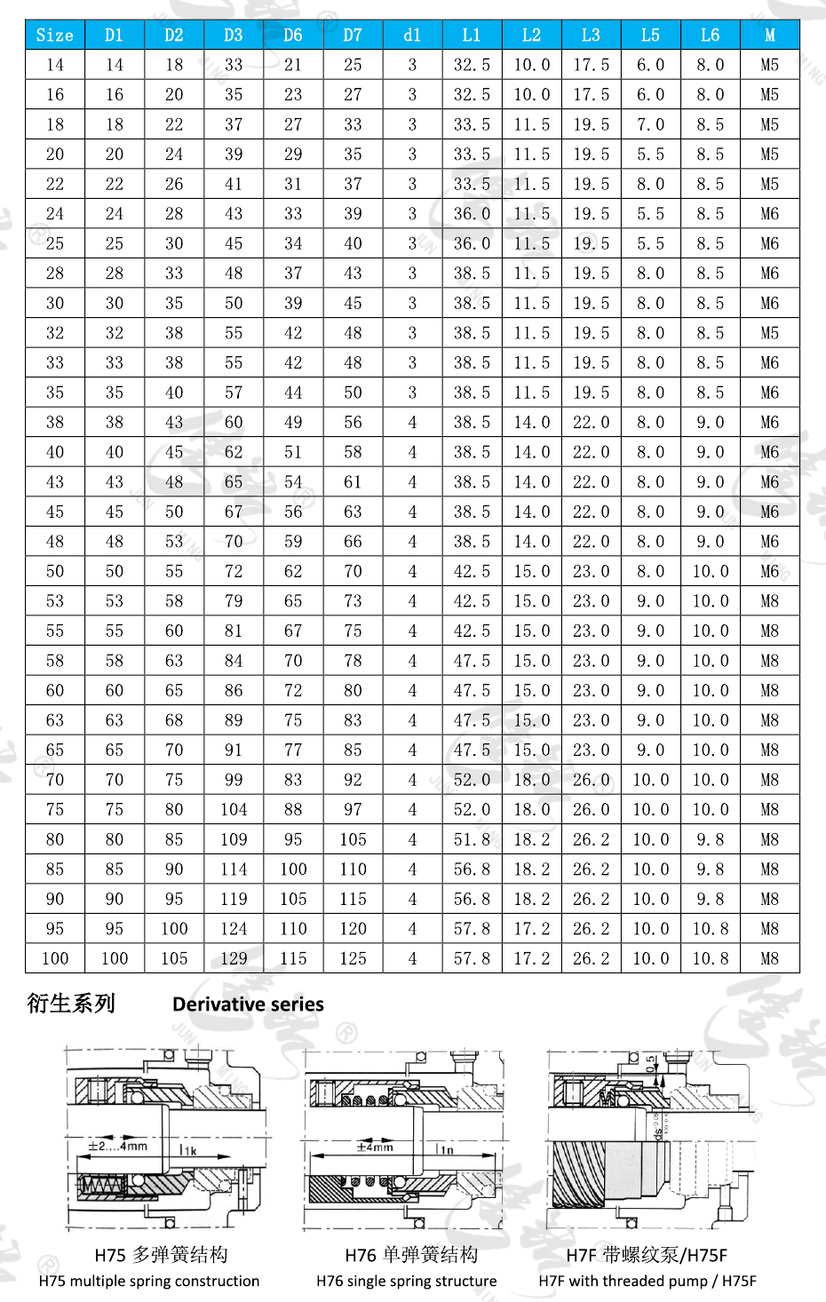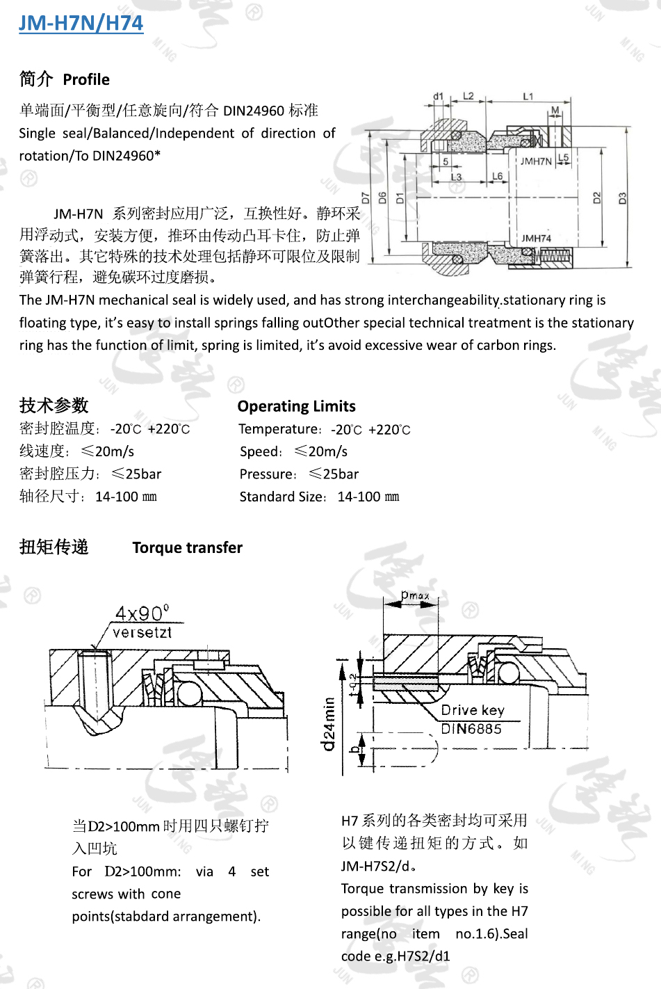 H7N系列密封應(yīng)用廣泛,互換性好。靜環(huán)采用浮動(dòng)式,安裝方便,推環(huán)由傳動(dòng)搭子卡住,防止彈簧落出。其它特殊的技術(shù)處理包括靜環(huán)可限位及限制彈簧行程,避免碳環(huán)過度磨損。